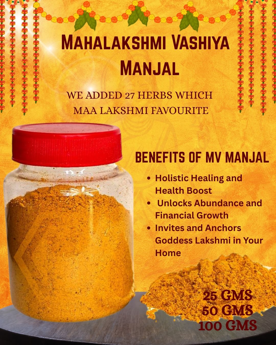 Mahalakshmi VashIya Manjal is considered highly sacred and is traditionally used in spiritual rituals and poojas dedicated to Goddess Mahalakshmi. It is believed to attract wealth, prosperity, and positive energy while removing obstacles and negativity from life. This divine turmeric holds great significance in enhancing devotion, purity, and blessings in every prayer.